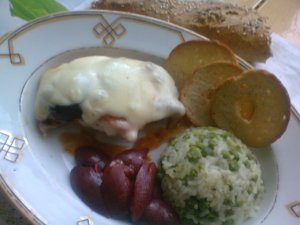 Megtálaljuk az ételt, A rizibizi gömbök kiadagolása, roppant egyszerű. Hidegvizzel kiöblítünk egy merőkanalat, beleszedjük a borsós rízst, kicsit megnyomkodjuk, a felesleget leszedjük, ezt a szép kis félgömböt tesszük tányérra. Egyben marad, nem hullik atomjaira, csak a nedvesített eszköz a titok.