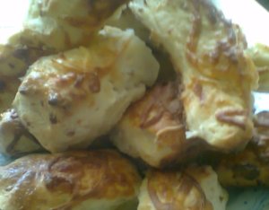 Ekkor átgyúrjuk, enyhén lisztezett deszkán 1 cm-es magasságúra igazgatjuk, nem szükséges hozzá nyújtófa és a kívánt formára vágjuk. Kivajazott tepsibe tesszük, tetejét megkenjük a megmaradt tojás sárgásával, megszórjuk sajttal és középmeleg sütőben 20-25 perc alatt készre sütjük.
