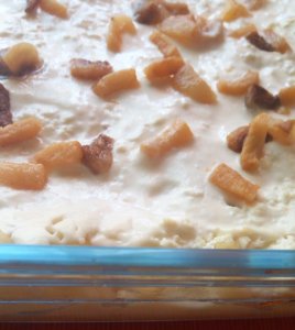 A tésztára 40 dkg túrót, erre 40 dkg tejfölt öntöttem. Tetejére szórtam a szalonnapörcöt.