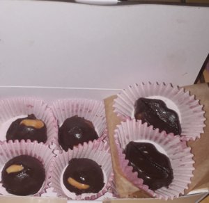 Először egy kanál csoki, utána az alkoholos datolya, majd befedjük ujabb kanál csokival.